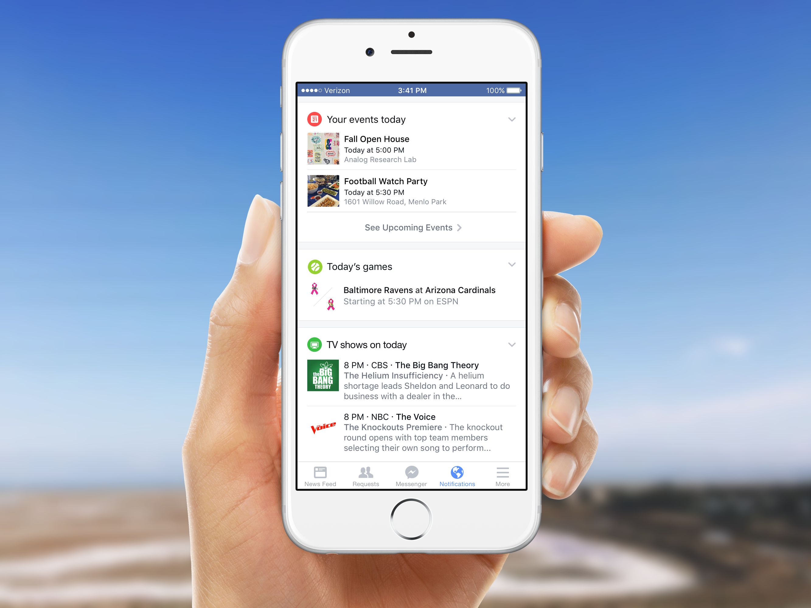 وأوضحت فيس بوك أنه إلى جانب الإشعارات الاعتيادية، أصبح بإمكان المستخدمين رؤية “معلومات مخصصة في الوقت المناسب”، ويشمل ذلك الأحداث الرئيسية الخاصة بالأصدقاء، مثل أعياد الميلاد، والمناسبات الشخصية الحياتية، بالإضافة إلى نتائج المباريات الرياضية وتذكيرات العروض التلفزيونية، وذلك بالاستناد لما هو معجب به المستخدم من صفحات.